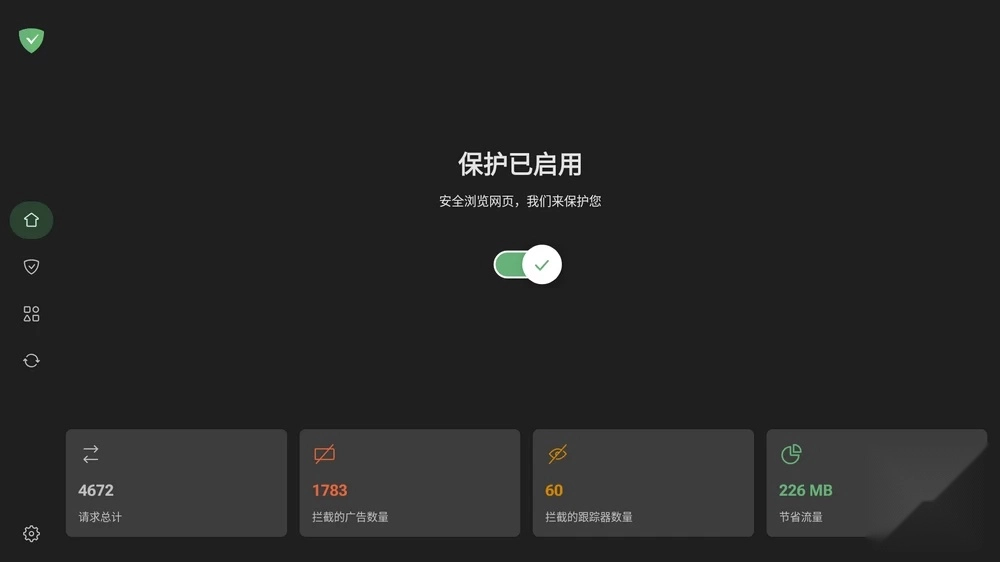 之后点击屏幕正中央的橙色圆圈,变成绿色勾就表示激活AdGuard广告拦截功能了,开始安全浏览网页吧!