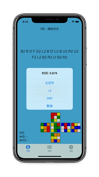 【计时】:除了常规的计时外还支持WCA观察、启动延时,每次计时结束后可确认+2/DNF,计时精确度为0.001秒。