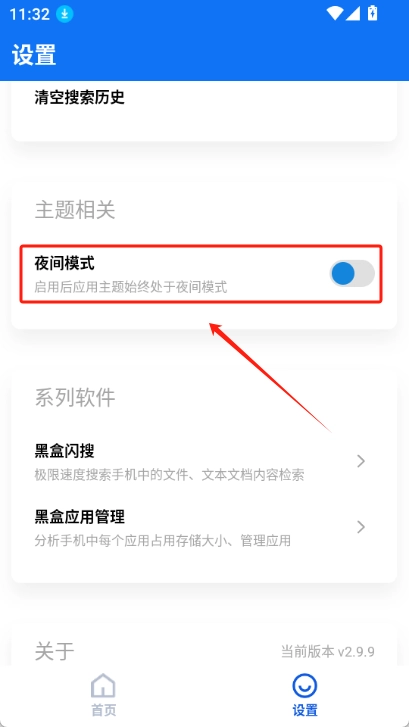 1.打开黑盒闪清应用。点击右下角的设置按钮。找到夜间模式选项。