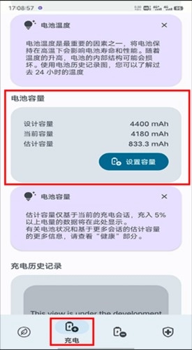 2、点击下方菜单栏中的“充电”按钮进入,在当前页面下滑找到电池容量即可查看电池出厂容量和预估容量(电池寿命);