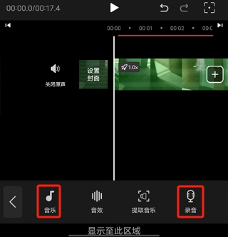 8. 进入“音频”功能界面,点击“音乐”可为视频添加背景音乐,或者选择“录音”功能进行实时配音。
