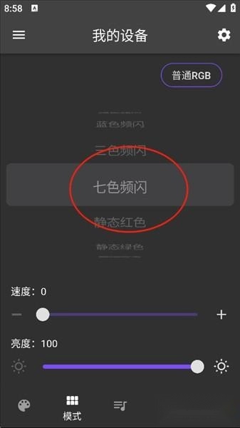 3、模式切换:在“模式”界面可选择频闪、呼吸、循环等预设灯效模式,实时预览效果。