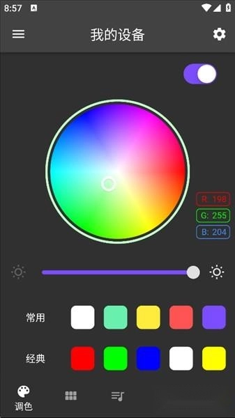 2、调色操作:进入“调色”界面,拖动颜色盘即可自定义RGB配色,调节亮度滑条调节明暗度。