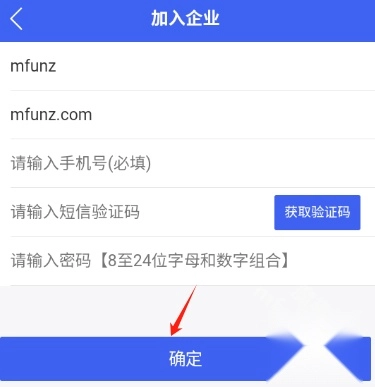 3.最后输入企业邀请码、个人姓名、手机号以及验证码和密码点击确定即可成功注册