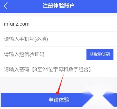 5.然后填写企业名称、手机号、验证码和密码,点击申请体验即可注册。