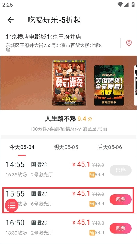 7、在具体的电影院界面选择时间段,然后点击购票按钮进行购买。