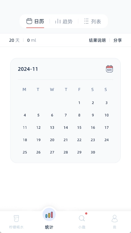 5. 每日饮水统计:应用的柠檬喝水每日统计日历功能,以图表形式展示每日喝水数据和趋势变化,一目了然。