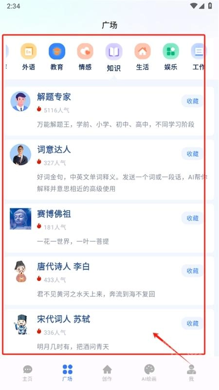 3、在广场页面选择感兴趣的AI机器人提问。