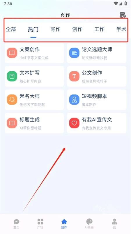 4、点击创作,提供写作、学术等多种功能。