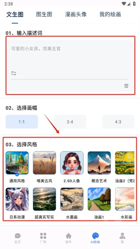 6、在AI绘画页面,输入描述词,选择风格点击生成画作。