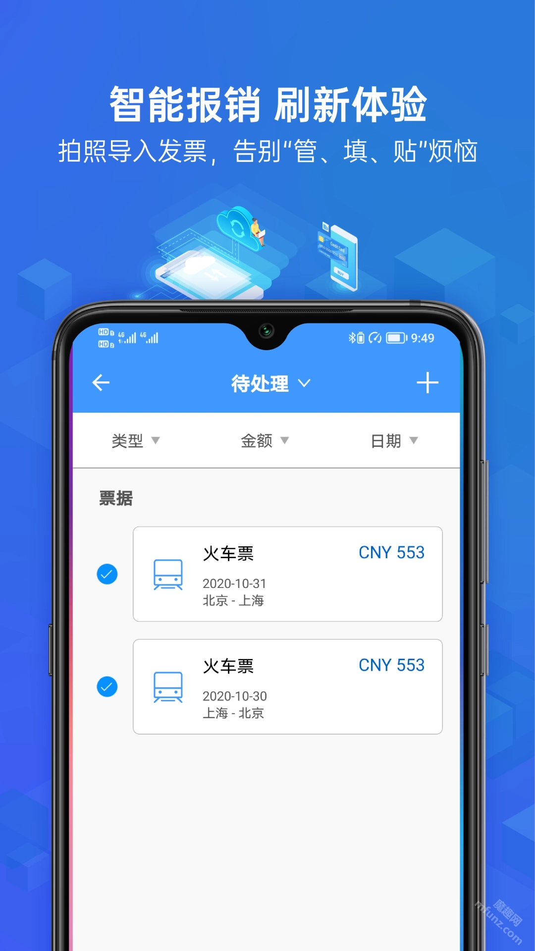 极简报销:发票一键拍照识别,无需贴票,实时掌控进度。