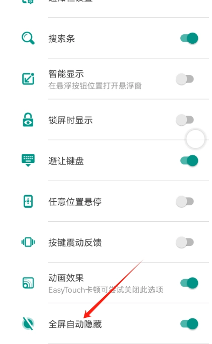 进入高级设置界面,找到“全屏自动隐藏”选项,把它后面的开关开启,这样就能隐藏easytouch图标了。