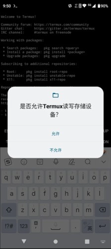 在 Termux 中输入命令 termux-setup-storage 回车以获取储存权限(注:长按后按 Paste 粘贴),如下图,点允许即可。