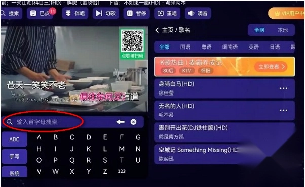 6、在搜索歌曲时输入首字母就可以找歌了,基本上跟ktv操作一模一样。
