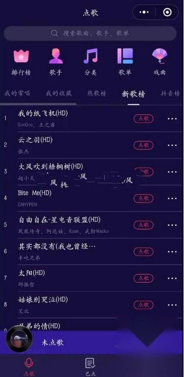 5、打开首页后,可以搜索歌曲,歌手,还有排行榜,功能跟ktv软件一样的操作。