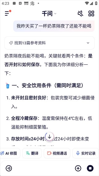 千问软件整合了丰富多样的资源内容,用户能够借助它搜索各类想了解的问题,只需把自身需求输入软件,AI大模型就会依据这些需求给出相应回答,以此满足不同用户的需求,助力用户解决问题。软件界面简洁清爽,功能完备且实用,用户可以在其中挑选适合的功能使用,还能上传图片、视频、文件等多种资源,软件会提取并整理这些信息内容,为每位用户提供服务,从而解决用户的需求。