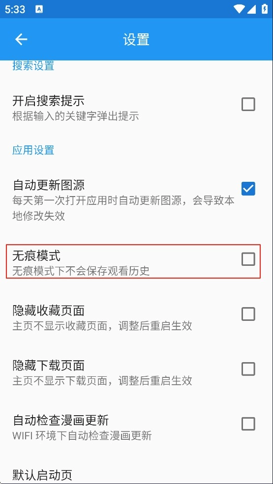 4、然后手动勾选“无痕模式”即可,之后浏览漫画,就不会留有痕迹了。