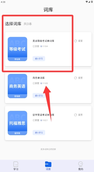 2、选择需要掌握的单词库,点击“进入学习”即可更换词库
