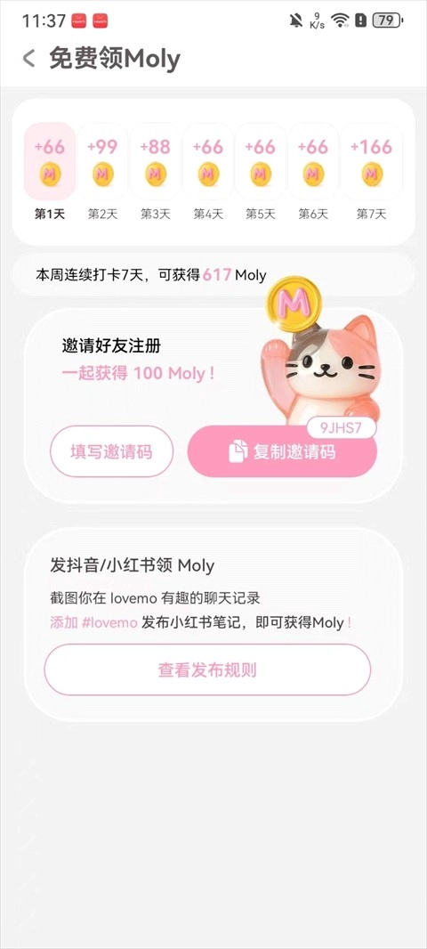 2、可通过邀请好友注册或将lovemo分享至抖音/小红书推广来获取Moly币!