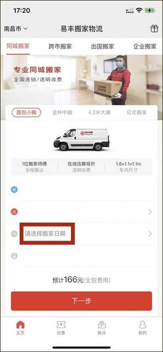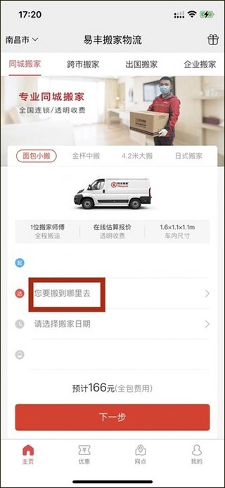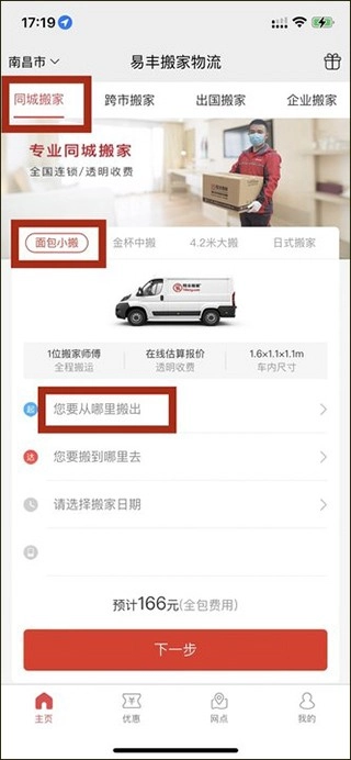 1、在易丰搬家物流的首页上选择“同城搬家”和“面包小搬”,点击“地址”;