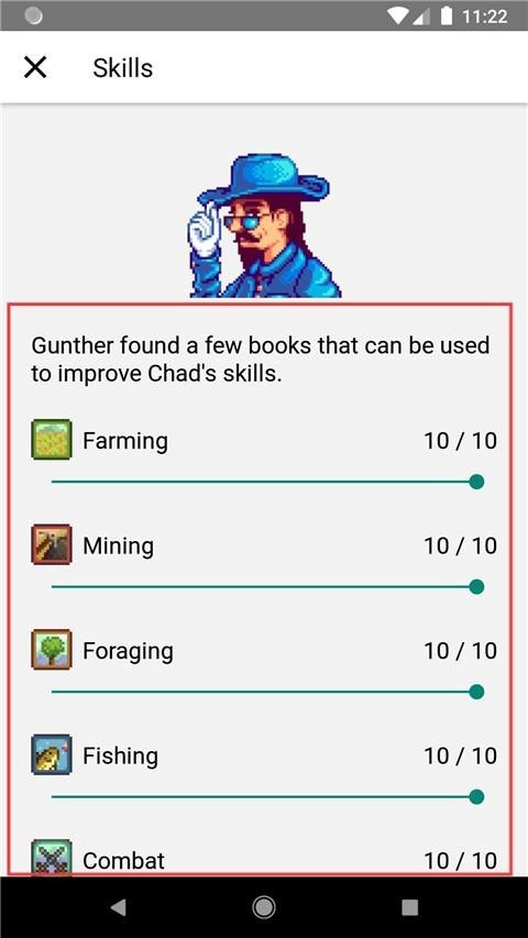 1、进入【Skills】界面进行查看,可了解到Chad的各项技能均已达到10/10的满值状态。