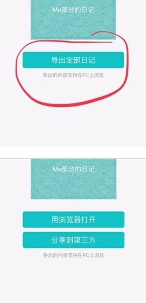 2、如下图,点击 导出全部日记,得到图二,可以选择分享到第三方或者用浏览器打开