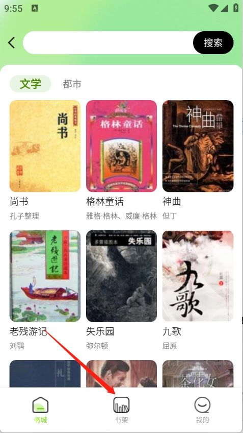 2、“书城”页面包含了很多的小说资源类型,文学以及都市都有。