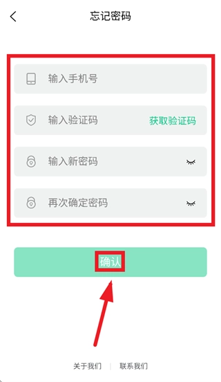 在找回密码的页面中,依次填写手机号码、验证码和新设置的密码,最后点击确认按钮就完成操作了。