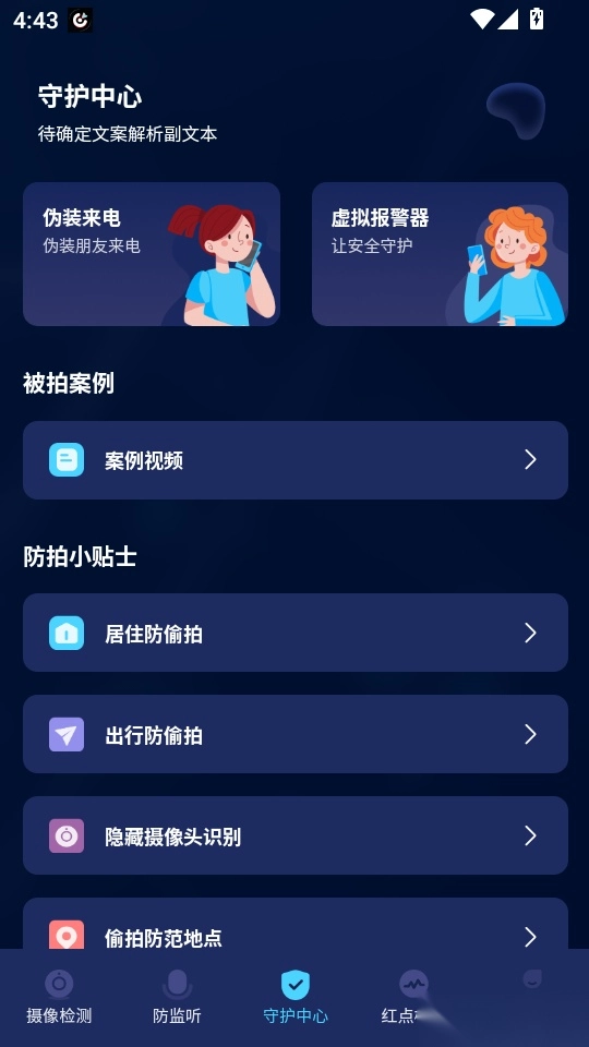 3.之后进入“守护中心”菜单界面,找到“防拍小贴士”模块下面的“隐藏摄像头识别”按钮进入下一步