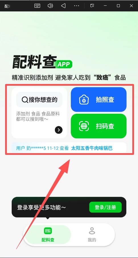 操作:在首页点击“扫码查”,直接扫描食品包装上的条形码。