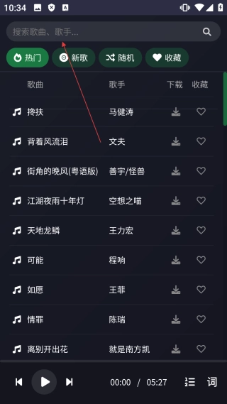 1、在软件界面找到搜索框并点击,进入搜索界面后,输入想要查找的歌曲或歌手相关关键词。