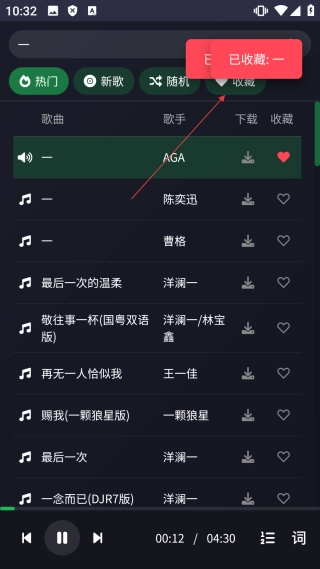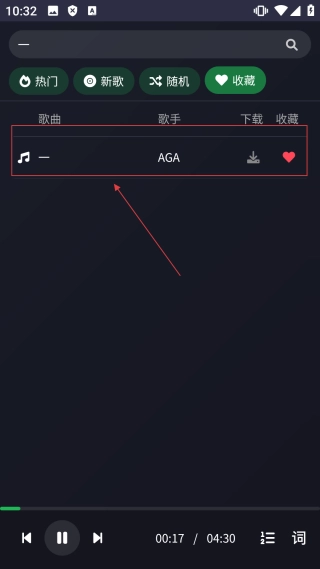 2、进入搜索结果界面后【点击目标歌曲的收藏图标】,进行歌曲收藏操作。