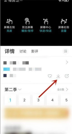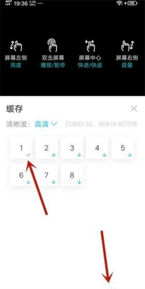 4、能够在弹出的页面中选择清晰度,以及用户需要集数,然后点击下面的显示蓝色的↓标识。