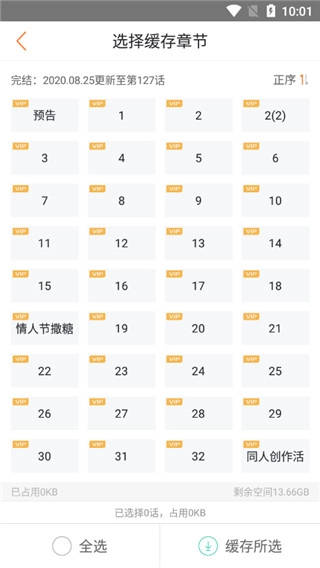 3、选择要缓存的章节,点击右下角所选即可完成缓存漫画,进行离线阅读。