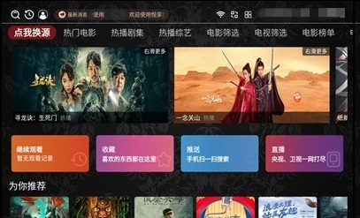 1、打开后默认提示可以更换首页的源,只需要点击导航第一个【点我换源】就可以了,悦享影视支持点播+直播