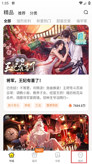 1、打开手机里的点点穿书APP,进入“书城”页面,这里有海量正版优质小说资源供用户选择,接着点击底部导航栏最右边的“我的”选项。