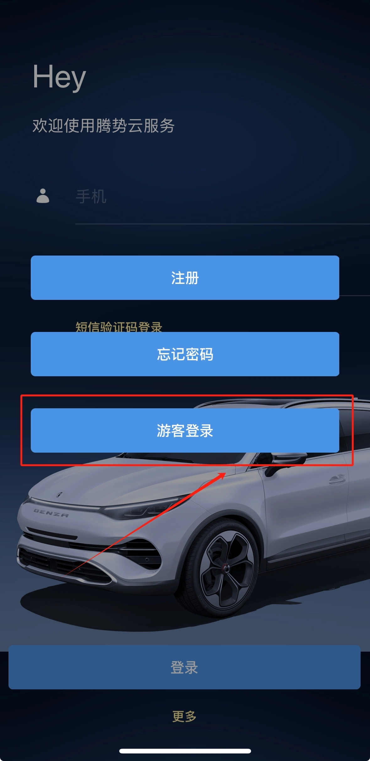 1、打开腾势智能互联应用,进入登录页面后,点击“更多”选项。