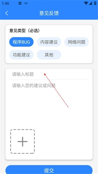 4、在意见反馈界面,选择意见类型,输入标题和内容,可添加图片后点击【提交】按钮,完成反馈提交。