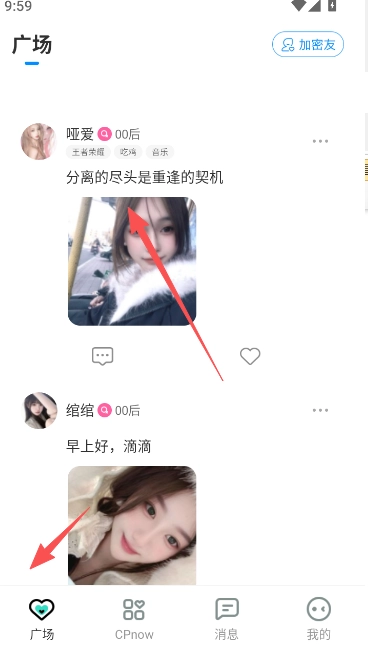 2、广场上,有许多用户在此发布分享照片,可以选择你喜欢的男生女生类型,留言对谈交流。