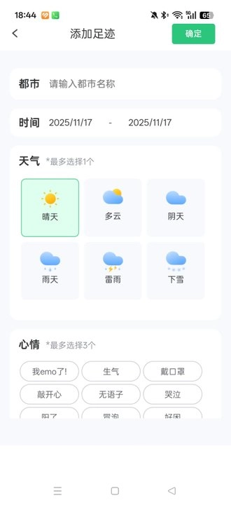 2、添加都市足迹,需要编辑都市名称、天气以及心情等添加,还可以编辑所要记录的内容部分。