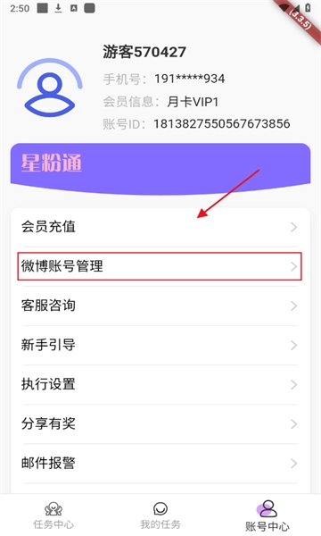以下是详细的星粉通微博账号绑定步骤