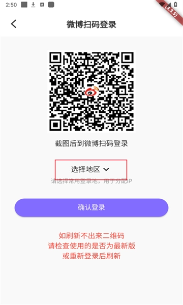 将二维码截图后,到微博进行登录,同时点击选择地区