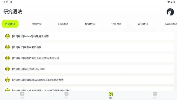 这款学习方式多样。首页有词语讲解和句子类型板块;在单词页面能制定每日背单词计划,采用科学记忆模式;语法页面有细致讲解,助你了解基础语法;练习页面可掌握答题技巧并进行题目训练。