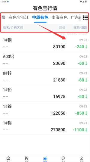 3、进入行情页面,可浏览各区域有色金属的实时报价。