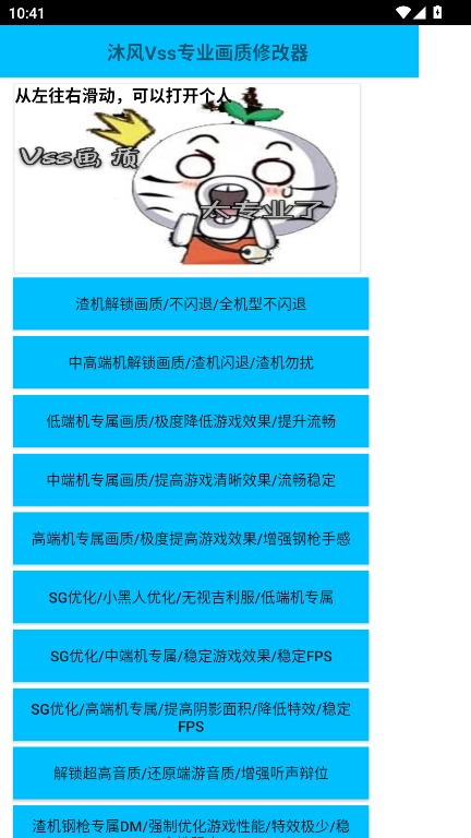 沐风Vss专业画质可以帮助玩家轻松调整游戏画面,使视觉效果更加清晰流畅,即便手机配置普通,也能拥有良好的画面表现,游戏运行依旧顺畅不卡顿。你能够自由调节亮度、对比度、饱和度和锐度等参数,打造出自己觉得最舒适的画质风格,特别是在玩射击游戏时,能看得更清晰,更容易察觉隐藏在暗处的对手。这款软件操作简单,打开后直接选择游戏就能开始调整,能让你的吃鸡体验更上一层楼。