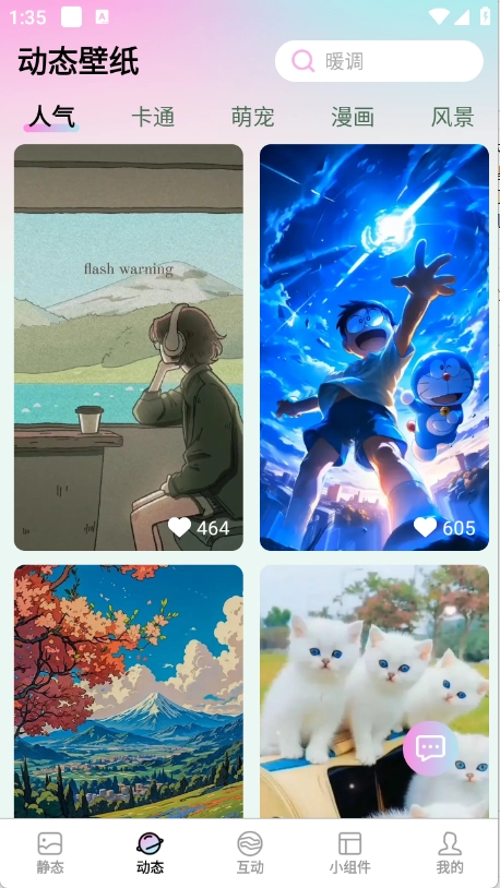1、安装最新版百变壁纸精灵,无论你偏爱治愈系插画、梦幻动态效果,还是触控式交互效果,都能在这里找到心仪的内容。