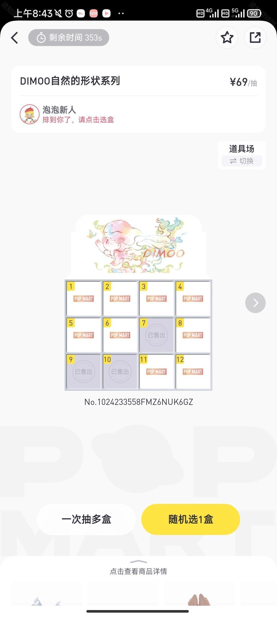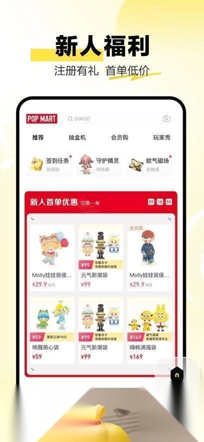 1、打开App首页后,点击“商品”或“新品”板块,从中挑选心仪的系列(像SKULLPANDA、DIMOO这类)。 2、选中感兴趣的盲盒系列,查看里面的款式以及各款式的出现概率,然后点击立即购买。