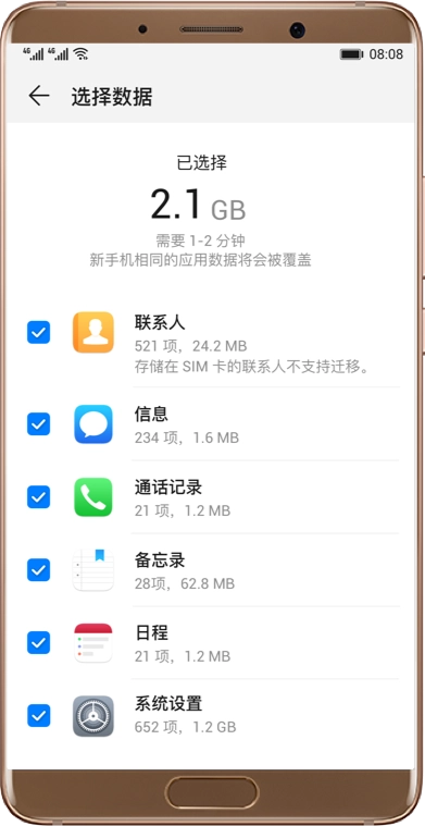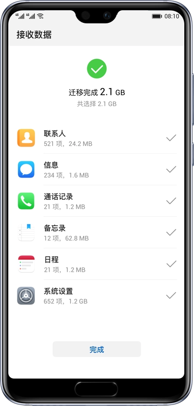 确认连接后,按需勾选想要转移的数据类别,点击【开始迁移】,几秒到几分钟内即可完成全部数据同步。