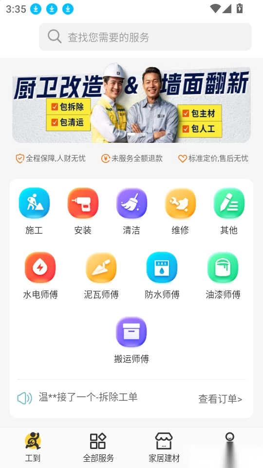 软件提供了线上的即时用工,业主可以随时发单下单,工友师傅可以在线接单服务。
