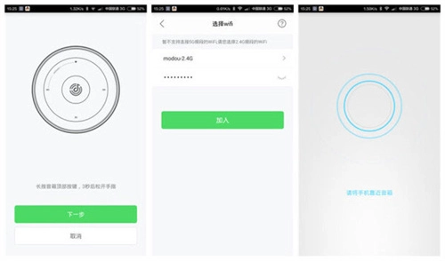 第一次打开之后会自动提示联网界面,长按音箱顶部物理按钮3秒进行联网状态,然后端点击下一步,输入WiFi密码点击加入,此时手机会发出声波进行配对音箱,配对成功之后,就会进入界面!尽情欣赏歌曲!